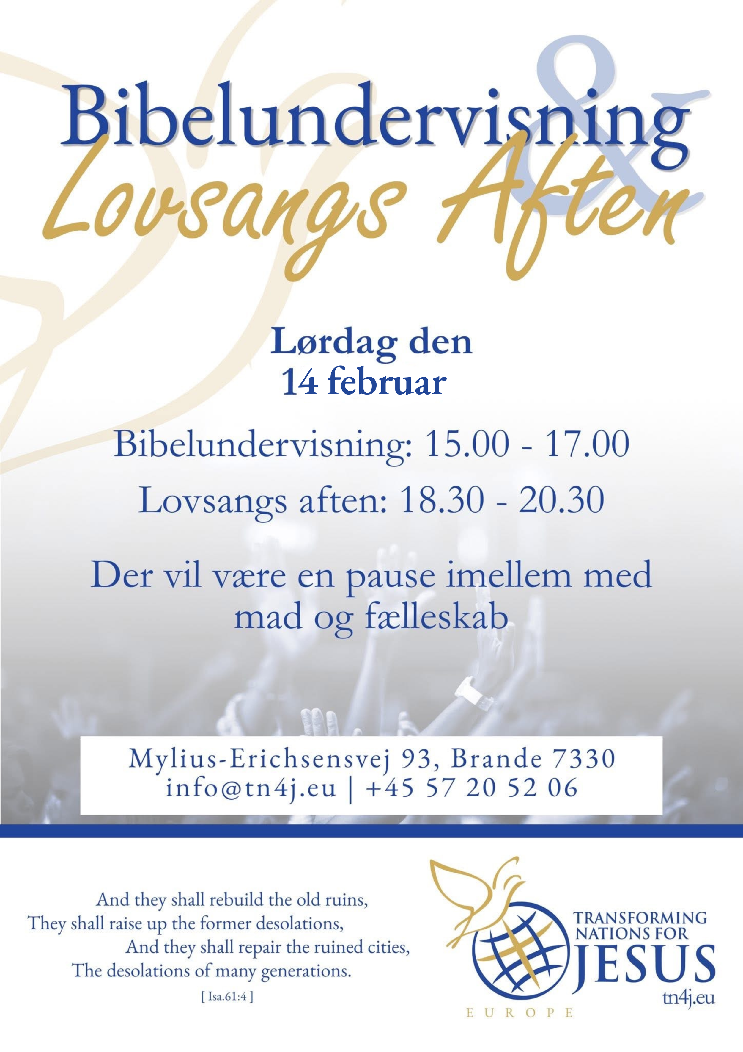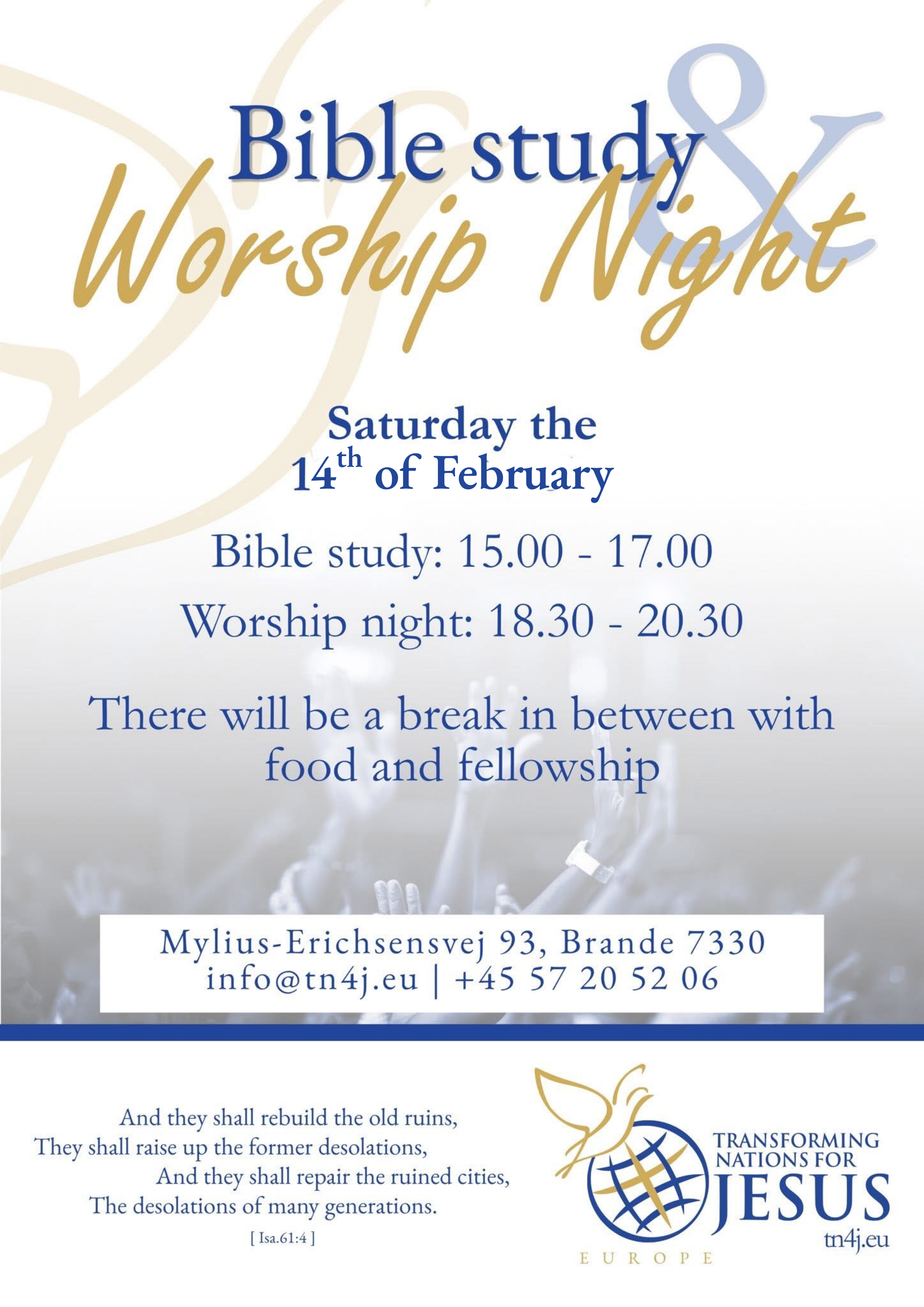 This is time for Europe to come back to Jesus and know our Risen Savior intimately. This is an evening where we will turn and set our eyes on Him. We will delve deeper into the word of God in the Bible study and press into His presence with worship and prayer in the Worship evening.